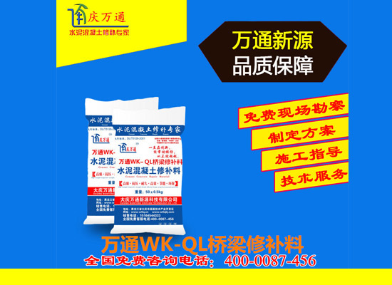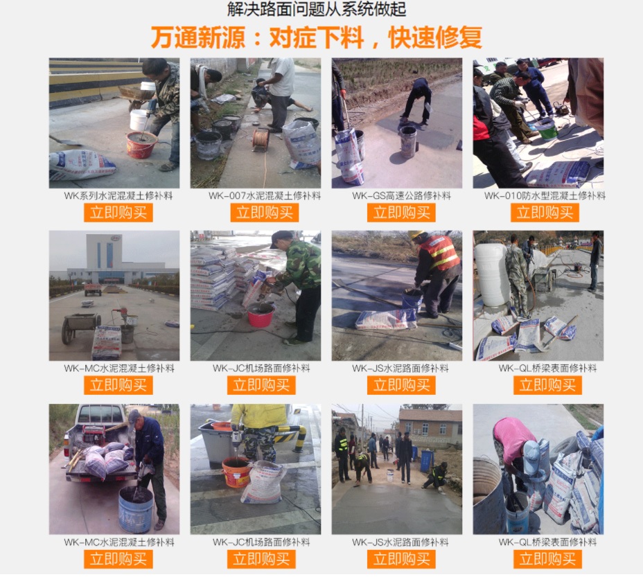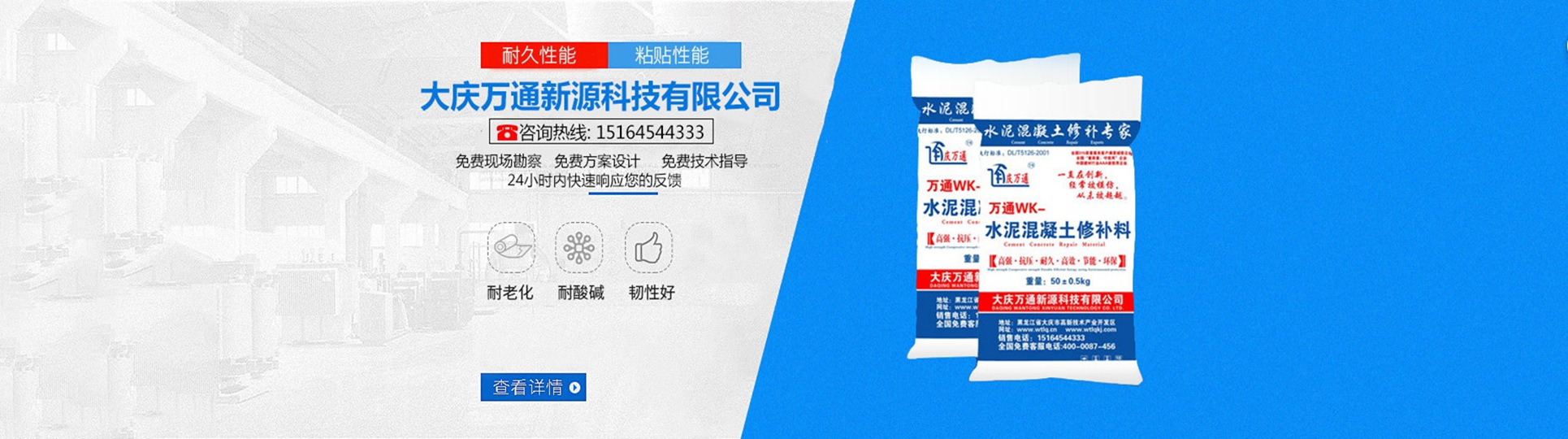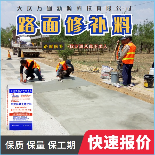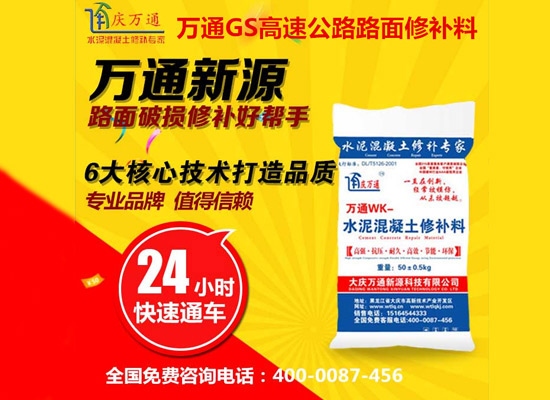 大慶萬(wàn)通新源科技有限公司獨(dú)有的混凝土路面高強(qiáng)速補(bǔ)料,是水泥混凝土路面病害修復(fù)的好材料。疲勞、凍融循環(huán)、彎曲壓力、滲水和基層破壞等原因都會(huì)引起水泥路面的破損,從而帶來(lái)高昂的維護(hù)費(fèi)用。與以往的剛性修補(bǔ)方法不同,混凝土水泥路面維修速補(bǔ)膠提供了一種獨(dú)特的柔性修補(bǔ)產(chǎn)品和技術(shù),高柔性、高抗拉性,可跨伸縮縫施工和高抗壓性使得混凝土快補(bǔ)產(chǎn)品為水泥混凝土路面提供了******性的修補(bǔ)。傳統(tǒng)的剛性修補(bǔ)方案,如環(huán)氧砂漿和快干水泥產(chǎn)品,由于其自身的粘結(jié)失效,抗疲勞性低以及與原路面不同的伸縮系數(shù),修補(bǔ)面會(huì)在短時(shí)間內(nèi)失效或產(chǎn)生新的裂縫,需要反復(fù)修補(bǔ),有效期短且費(fèi)用高昂。大慶萬(wàn)通新源科技有限公司的混凝土水泥路面維修速補(bǔ)膠可以隨原路面一起伸縮,移動(dòng),從而避免了粘結(jié)失效和產(chǎn)生新裂縫。萬(wàn)通快補(bǔ)產(chǎn)品優(yōu)異的粘結(jié)性、柔韌性和高防滑性,特別適用于水泥路面的淺層粘合修補(bǔ),多邊角混凝土板層修補(bǔ),跨伸縮縫修補(bǔ)以及路面沉陷修補(bǔ)。萬(wàn)通混凝土病害修補(bǔ)料針對(duì)混凝土起皮起沙、斷板裂縫、蜂窩麻面、坑槽露石子、漏筋掉皮、橋梁的掉皮漏筋快速通車(chē)使用時(shí)間長(zhǎng)。應(yīng)用萬(wàn)通快補(bǔ)產(chǎn)品,施工后一天就可以恢復(fù)交通。大慶萬(wàn)通新源科技有限公司的萬(wàn)通水泥路面維修速補(bǔ)膠適用于高速公路、機(jī)場(chǎng)路面、農(nóng)村村村通路面、廠(chǎng)坪、學(xué)校操場(chǎng)、市區(qū)公路、小區(qū)路面、橋梁、水泥路面的修補(bǔ)。使用萬(wàn)通特快補(bǔ)材料修補(bǔ)路面可以一勞永逸! 水泥地面起砂怎么辦,混凝土修補(bǔ)劑混凝土地面起砂,混凝土地面修補(bǔ),地面起砂怎么辦,